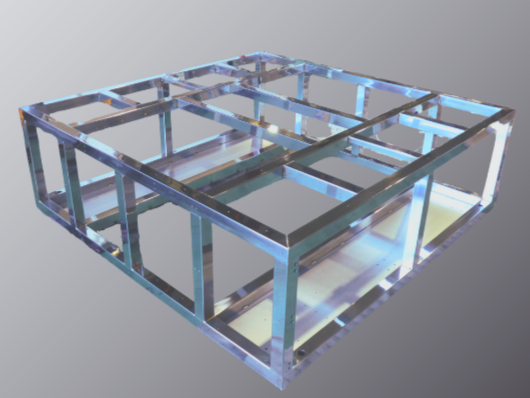 精密機械向けの架台のため、鉄材ではなくステンレスを採用し製造しております。また、こちらの製品はパイプ材を溶接し組み立てることで架台にしております。表面はバフ研磨で仕上げております。